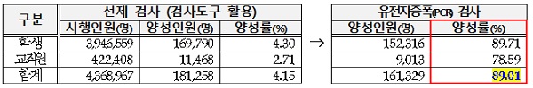 ▲ 검사도구 활용 선제검사 및 유전자증폭(PCR) 검사 결과(3.2.~3.7.).교육부는 또 4월 선제검사 시행과 관련해 시도교육청과 관계기관의 의견을 지속해서 수렴했으며, 지난 15일 식품의약품안전처·질병청과 간담회를 열어 4월 지속 추진 방향에 대해 논의했다. 필요 물량 수급에 차질이 없도록 식약처에도 협조를 요청했다.