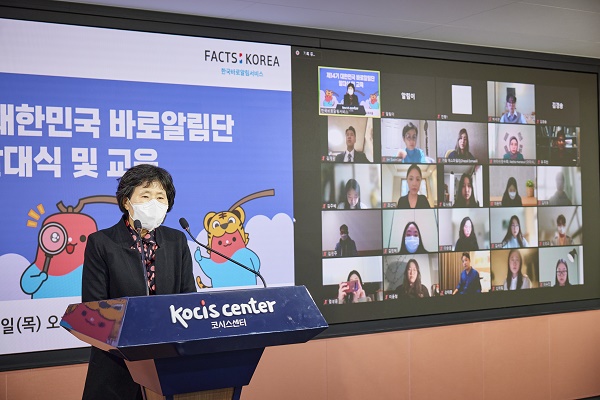 ▲ 박명순 해외문화홍보원장이 17일 제14기 대한민국 바로알림단 발대식에서 바로알림단원들에게 격려사를 하고 있다. (사진=문화체육관광부)‘바로알림단’은 해문홍(KOCIS)의 ‘한국바로알림서비스’ 사업과 연계해 2013년부터 해외 언론매체 누리집 등에서 한국에 대한 오류를 찾아내고, 외국인들에게 올바른 정보를 알리고 있는 민간 참여 알림단이다. 한국문화에 대한 관심이 많고 외국어를 활용할 수 있는 국내외 일반인을 대상으로 공모를 거쳐 단원을 구성한다.