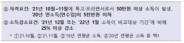 ▲ 자격요건 및 소득감소요건.이번 5차 긴급 고용안정지원금에 대한 보다 자세한 사항은 전화상담실(1899-9595) 또는 고용노동부 누리집(www.moel.go.kr)의 5차 긴급고용안정지원금 사업 공고문을 확인하면 된다.