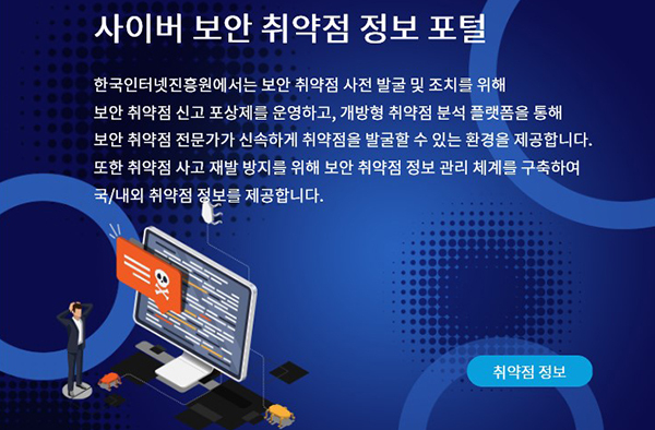 [일간환경연합 장민주 기자]국가 차원에서 국내·외 보안 취약점을 체계적으로 수집·관리하고 수집된 정보를 다양한 이용자가 편리하게 확인·개선하는 ‘사이버보안 취약점 정보포털’이 오는 24일부터 본격 개시한다.