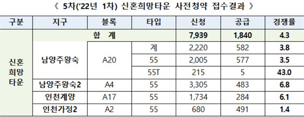 ▲ 5차(‘22년 1차) 신혼희망타운 사전청약 접수결과.