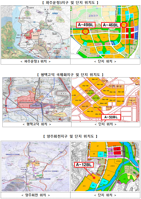 ▲ 파주 운정3 지구 등 민간분양 단지 위치도.파주 운정3 지구 A46블록에서는 전용 84㎡ 383가구(사전청약 345가구)를 제일건설에서 공급하고 A49블록에서는 전용 59㎡, 84㎡ 486가구(사전청약 438가구)를 시티건설에서 공급한다.