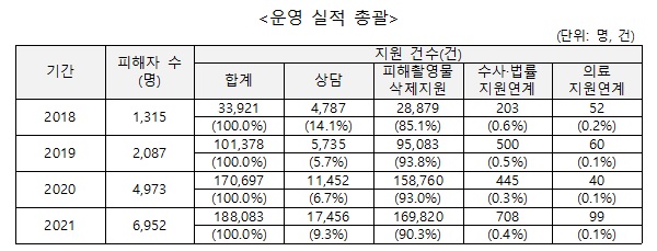 지난해 피해 촬영물 삭제지원 실적은 16만 9820건으로 2020년(158,760건) 대비 7% 증가했다. 플랫폼별 삭제지원은 성인사이트가 5만 9113건(34.8%)으로 가장 많았고, 이어 소셜미디어 3만 1980건(18.8%), 검색엔진 3만 372건(17.9%) 등의 순이었다.