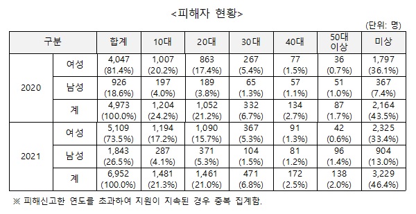 연령별 피해자 현황에 따르면 10대(21.3%)와 20대(21.0%)가 전체의 42.3%인 2942명으로, 연령을 밝히지 않은 피해자 46.4%(3229명)를 제외하고 다수를 차지하고 있다.