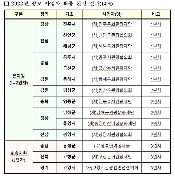 올해 지원받을 신규 또는 2년 차 11개 조직은 ▲강원 동해시 (사)동해문화관광재단▲강원 평창군 (사)평창군관광협의회 ▲충북 영동군 (재)영동축제관광재단 ▲충남 공주시 (사)공주시관광협의회 ▲충남 금산군 (재)금산축제관광재단 ▲경남 진주시 (재)진주문화관광재단▲경남 통영시 (재)통영한산대첩문화재단 ▲경남 남해군 (재)남해군관광문화재단 ▲전남 광양시 (사)광양시관광협의회 ▲전남 신안군 (사)신안군관광협의회 ▲전남 해남군 (재)해남문화관광재단이다.