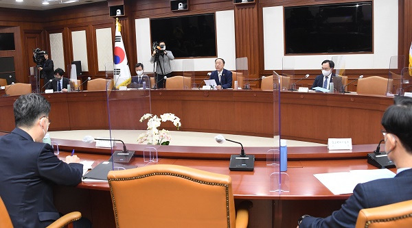 ▲ 홍남기 부총리 겸 기획재정부 장관이 8일 서울 광화문 정부서울청사에서 열린 ‘제6차 대외경제안보 전략회의’를 주재하고 있다. (사진=기획재정부)이날 회의에서는 최근 글로벌 경제에 대한 진단 및 점검도 있었다.