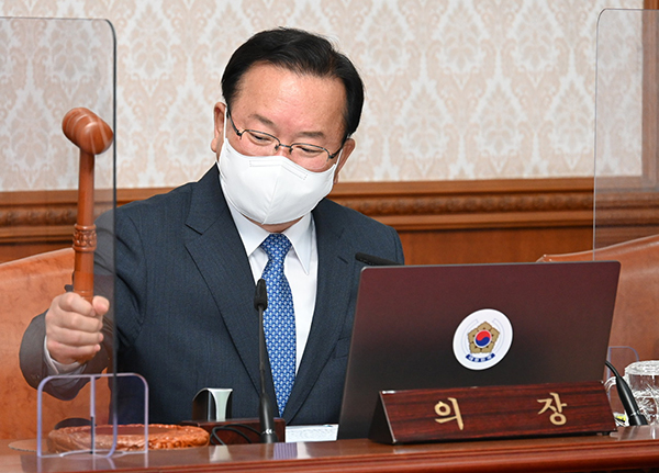 ▲ 김부겸 국무총리가 12일 서울 세종로 정부서울청사에서 열린 국무회의를 주재하고 있다.(사진=국무조정실)김 총리는 “각 부처와 지자체에서도 소속 공무원의 복무점검과 공직기강 확립에 철저를 기해달라”고 주문했다.