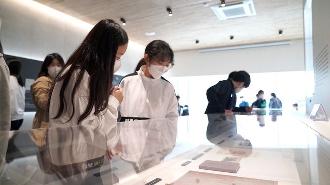 개관 기념 특별전 「뜻을 세우다, 나라를 세우다」를 관람 중인 학생들