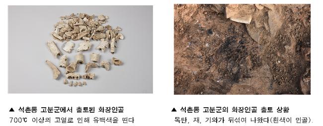 석촌동 고분군에서는 다량의 인골 파편이 출토되었는데, 성분 분석을 통해 700℃ 이상의 높은 온도로 화장된 것임을 입증하였다. 인골의 화장 여부와 온도를 분석과학으로 밝힌 것은 국내에서 최초의 사례이다. 무엇보다 고인골학(서울대학교)과 법의학(카톨릭대학교) 연구진의 분석 결과를 교차 연구를 통해 확증함으로써 고인골 연구의 새로운 국면을 열었다는 평가와 함께 협업 연구의 우수 사례로 주목받고 있다.