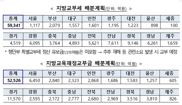 지방교육재정교부금은 서울 6450억원, 부산 2840억원, 대구 2323억원, 인천 2868억원, 광주 1686억원, 대전 1583억원, 울산 1257억원, 세종 605억원, 경기 1조1570억원, 강원 2595억원, 충북 2172억원, 충남 2777억원, 전북 2680억원, 전남 2969억원, 경북 3516억원, 경남 3810억원, 제주 826억원이다.