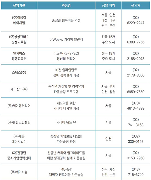 특히 일부 운영기관은 전국 주요 도시에서도 상담 프로그램을 운영해 수도권 외 지역의 중소기업 재직자도 경력설계 프로그램에 참여할 수 있는 기회를 제공한다.