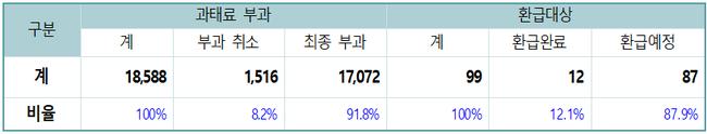지난해 12월부터 올해 3월까지 4개월 동안 계절관리제 운행제한에 단속된 배출가스 5등급 차량 7,128대에 1일 10만원의 과태료를 18,588건 부과하였고, 그간 저공해조치 완료 차량에 대해서는 1,516건(8.2%) 과태료를 부과 취소하고, 이 중 과태료 납부 99건은 환급 진행 중이다.