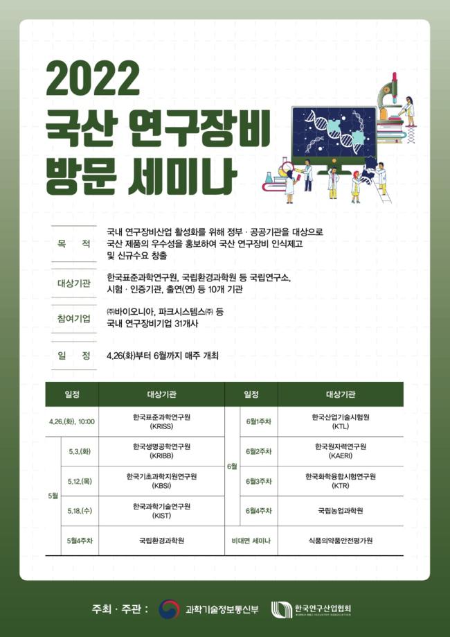 [일간환경연합 장민주 기자]과학기술정보통신부(이하 ‘과기정통부’)는 국내 연구장비 산업의 활성화를 위해 정부·공공기관을 대상으로 국산 제품과 그 우수성을 홍보하는 `국산 연구장비 방문 세미나` 를 4월 26일을 부터 6월말까지 매주 개최한다고 밝혔다.