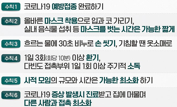 이날 중대본이 발표한 개인방역 6대 수칙은 ▲예방접종 완료하기 ▲올바른 마스크 착용으로 입과 코를 가리기 ▲30초 이상 비누로 손 씻고 기침은 옷소매에 ▲1일 3회 환기하기 ▲사적모임 규모와 시간은 가능한 한 최소화 ▲증상 발생 시 진료를 받고 집에 머물며 다른 사람과의 접촉을 최소화 하기 등이다.