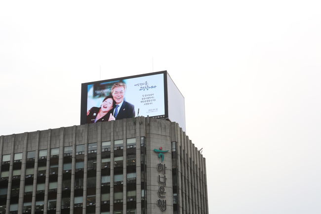 [일간환경연합 장민주 기자] 28일 서울 시내 대형 옥외광고판에 문재인 대통령과 김정숙 여사를 응원하는 광고가 뜨면서 지나가는 시민들의 이목을 잡았다.