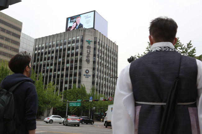 옥외광고에는 "다섯번의 봄, 고맙습니다"와 "두 분의 앞날이 봄꽃이 활짝 피는 따뜻한 봄날 같기를 소망합니다"라는 문구가 적혀 있다.