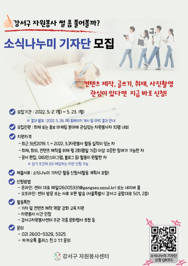 서울 강서구는 오는 5월 23일까지 지역의 자원봉사 소식을 취재하고 전하는 ‘소식나누미 기자단’을 모집한다고 밝혔다.