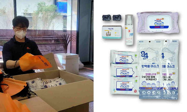 방역물품 꾸러미는 1인당 1세트가 지급되며, KF94 마스크, 손소독제, 손소독티슈, 항균비누, 물티슈, 마스크 스트랩(끈) 등 6종으로 구성된다.