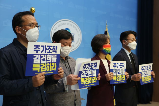 더불어민주당 의원들과 촛불승리전환행동 등 시민단체는 11일 서울 여의도 국회 소통관에서 기자회견을 열고 윤석열 대통령의 배우자 김건희 여사에게 제기된 도이치모터스 주가 조작 의혹에 대해 특별검사(특검) 도입을 촉구했다.기자회견에 참가한 민주당 강민정 의원은 "범죄 의혹이 제기된 사건들이 굉장히 많이 있었음에도 불구하고, 그동안 윤 대통령과 관계된 가족들 비리 의혹에 대해서는 제대로 수사되지 않았다"며 "시퍼렇게 살아있는 이 권력의 비리 의혹에 대해 수사하지 않고 공정과 상식을 얘기할 수 없다"고 말했다.