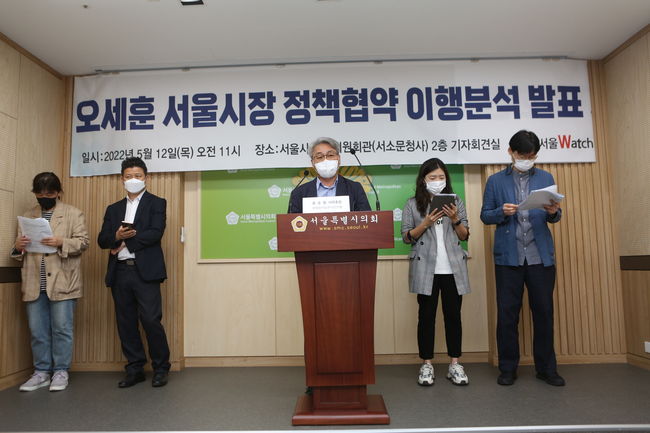 [일간환경연합 신상미 기자] 경제정의실천시민연합 등 시민단체 관계자들은 12일 서울 중구 서소문동 서울시의회 의원회관에서 오세훈 서울시장 정책협약 이행 분석 발표 기자회견을 가졌다.