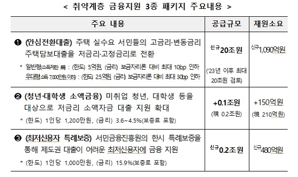 저소득 서민, 청년·대학생 등 취약계층을 대상으로 20조원 이상의 금융지원 3종 패키지도 공급한다.