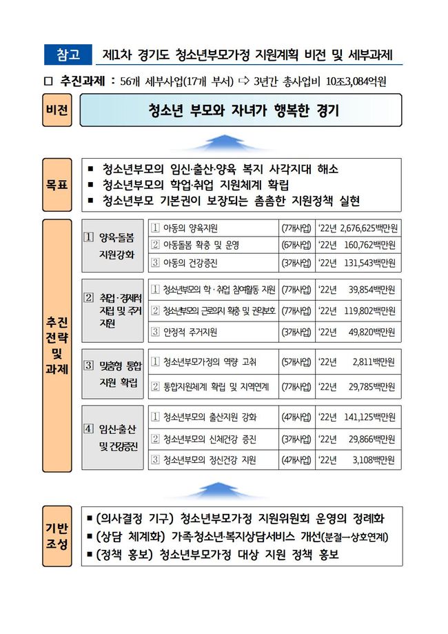 주요 내용을 살펴보면 도는 ‘청소년부모와 자녀가 행복한 경기’를 비전으로 ▲양육․돌봄 지원강화(아동의 양육지원, 아동돌봄 확충 및 운영, 아동의 건강증진) ▲취업․경제적 자립 및 주거지원(청소년부모의 학․취업 등 참여 활동 지원, 근로 의지 확충 및 권익 보호, 안정적 주거지원) ▲맞춤형 통합지원 확립(청소년부모 가정의 역량 고취, 맞춤형 통합지원체계 확립 및 연계 강화) ▲임신․출산 및 건강증진(청소년부모(산모) 출산 지원 강화, 건강증진 강화, 정신건강 지원) 등 4대 추진전략을 세웠다. 아울러 11개 추진과제 내 17개 부서의 56개 사업을 담았으며, 3년간 총사업비는 10조 3천84억 원(국비 6조 2천849억 원, 도비 2조 810억 원, 시군비 1조 9천425억 원)으로 추산했다.