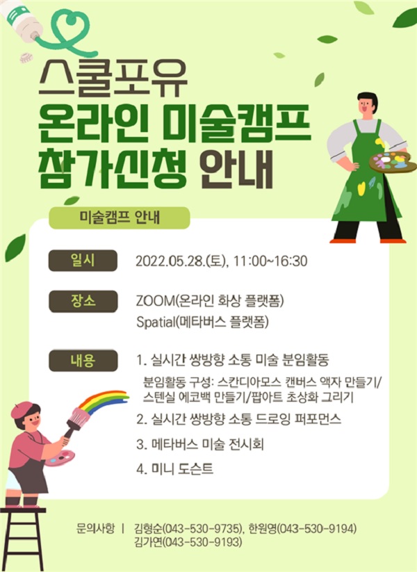[일간환경연합 장민주 기자]교육부와 한국교육개발원은 오는 28일 건강장애학생의 심리·정서 회복과 예술성 발달을 위한 ‘스쿨포유 온라인 미술 캠프’를 개최한다고 27일 밝혔다.