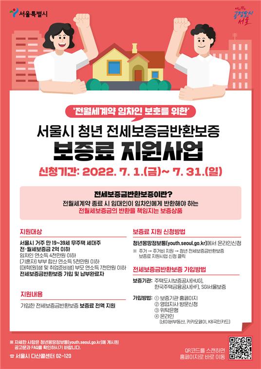 ‘전세보증금 반환보증’ 상품에 가입해 보증료를 납부 완료한 청년들에게 납부한 보증료 전액을 서울시가 되돌려주는 사업이다. 세입자가 전세보증금을 가장 확실하게 지킬 수 있는 ‘전세보증금 반환보증’ 가입을 유도함으로써 깡통전세 등 최근 늘어나고 있는 전세사기로부터 청년들을 보호하고, 주거안정을 도모하기 위한 취지다.