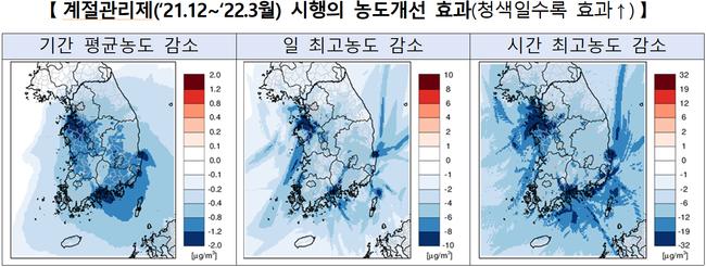2021년 12월부터 2022년 3월까지 제3차 계절관리제 기간 동안 전국 초미세먼지 평균농도는 23.3㎍/㎥으로 2020년 12월부터 2021년 3월의 전년 같은 기간 평균농도 24.3㎍/㎥에 비해 1㎍/㎥이 감소되어 약 4%가 개선됐다.