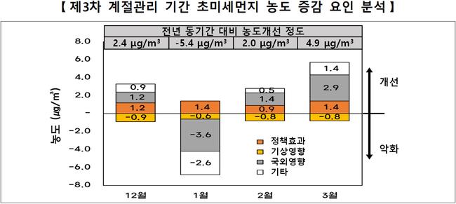 먼저, 부문별 미세먼지 감축과제 등에 따른 계절관리제 정책효과로 인해 월별 초미세먼지 평균농도는 0.9~1.4㎍/㎥ 감소한 것으로 분석됐다.