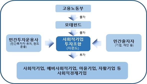고용노동부는 `11년부터 사회적경제기업의 규모화 및 자생적 생태계 조성을 위해 총 468억원 규모로 모태펀드를 조성하여 50개의 사회적경제기업 등을 대상으로 총 314억원을 투자하였다.