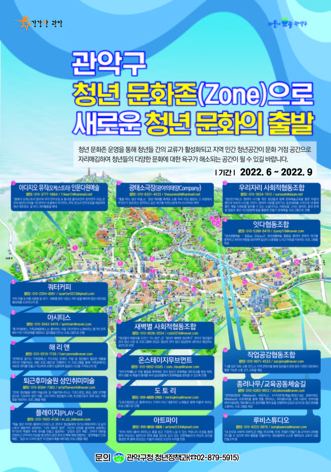 각 공간별 프로그램은 오는 6월부터 9월까지 운영되며, 각 프로그램의 세부 내용은 관악구청 홈페이지에서 확인 가능하다. 보다 자세한 내용은 관악구청 청년정책과 또는 각 프로그램 운영 공간으로 문의하면 된다.