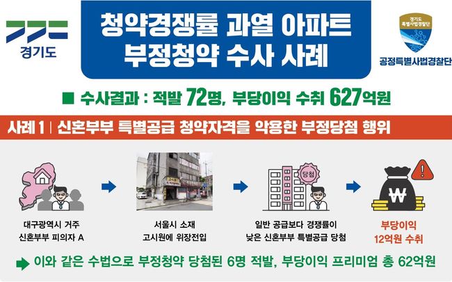 도 특사경은 A씨와 같이 신혼부부 특별공급 청약 자격을 부정한 방법으로 충족해 당첨된 6명을 적발했다. 이들의 부당이익은 총 62억 원에 이른다.
