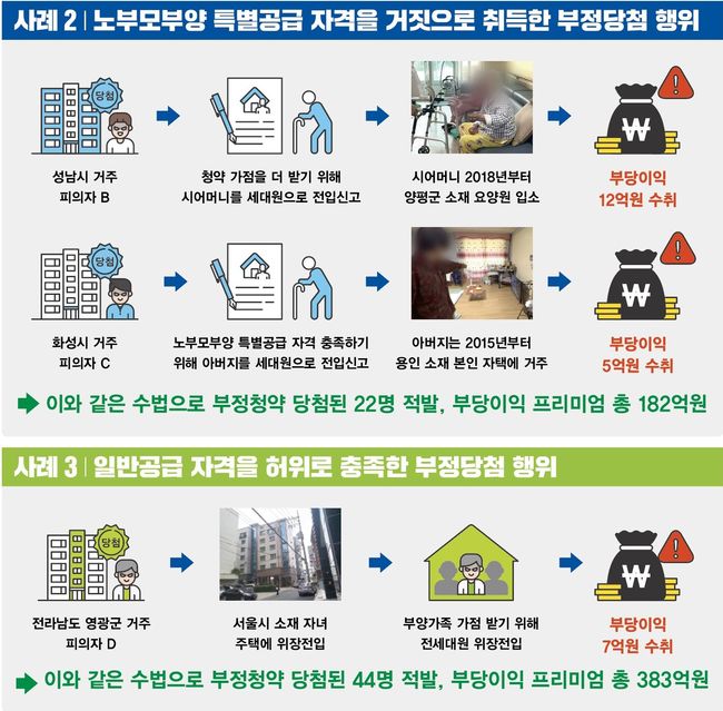 • 노부모부양 특별공급 자격을 거짓으로 취득한 부정청약자 22명 적발, 부당이익 182억 원