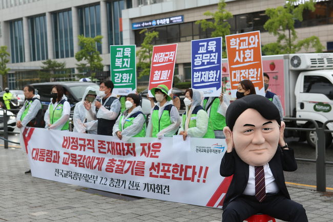 공공운수노조 전국교육공무직본부는 15일 서울 용산구 대통령실 앞에서 `교육공무직 7.2 총궐기 선포 기자회견`을 열었다.기자회견에서 교육공무직본부는 학교비정규직 대책 마련과 교육공무직 차별 철폐 등을 촉구하며 `불통 대통령` 퍼포먼스를 선보였다.