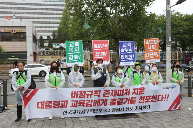 [일간환경연합 장민주 기자] 공공운수노조 전국교육공무직본부는 15일 서울 용산구 대통령실 앞에서 ‘교육공무직 7.2 총궐기 선포 기자회견’을 열었다.