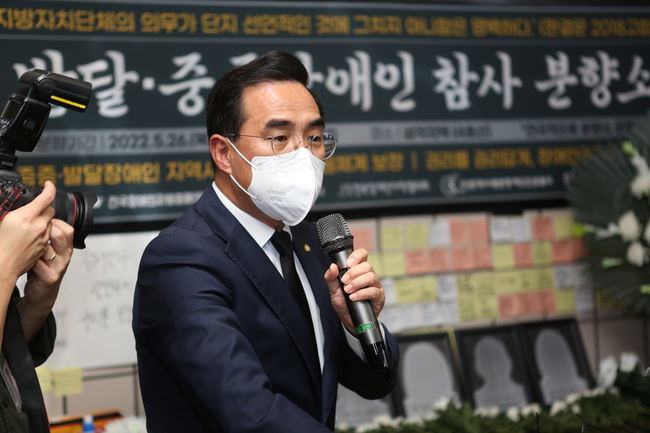 박홍근 더불어민주당 원내대표는 20일 서울 용산구 삼각지역에 마련된 발달 · 중증장애인 참사 분향소를 방문해 헌화했다.