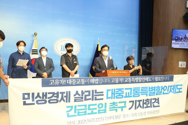 더불어민주당 우원식 의원, 이동주 의원, 전국철도지하철노동조합협의회, 민생경제연구소 등은 22일 서울 여의도 국회 소통관에서 기자회견을 열고 고유가, 고물가 대책의 일환으로 `대중교통특별할인 제도 도입`을 촉구했다. 기자회견에서 참가자들은 “해당제도가 긴급하게 도입되어 10% 정도의 교통비 할인이 이뤄지면, 2021년 도시철도 총 연간 승차운임수입 1조6000억원 기준으로 연간 약 1600억원의 대중교통비 지원효과가 발생할 것으로 예상되어 고물가로 어려워진 민생경제 회복에 큰 도움이 될 것으로 전망된다”고 주장했다.