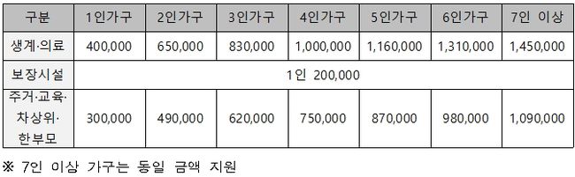 급여자격 · 가구원수별 차등 지급(1회 지급, 한시 지원)