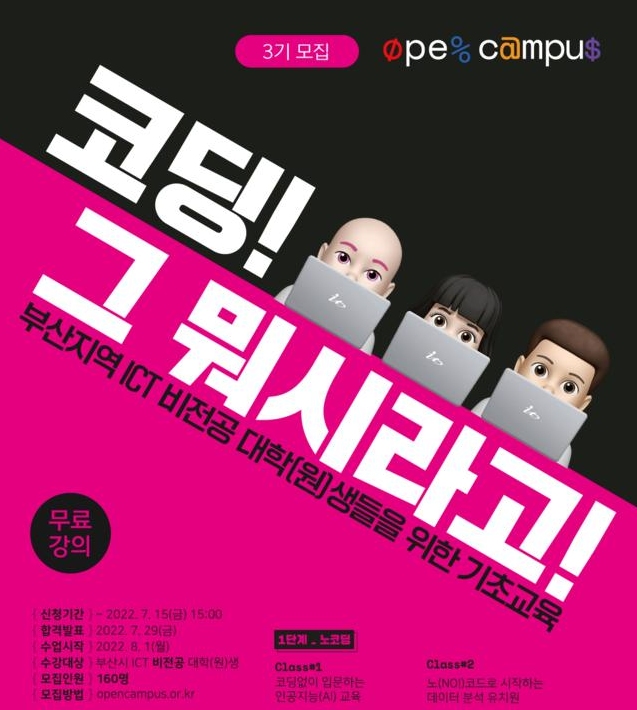 [일간환경연합 김경훈 기자] 부산시(시장 박형준)는 오는 8월 1일부터 운영하는 ‘비전공자 정보통신기술(ICT) 인력양성 오픈캠퍼스’ 교육생 160명을 다음 달 15일까지 모집한다고 밝혔다.