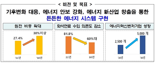 특히 2030년 원전 비중 30% 이상 확대를 제시해 탄소중립과 에너지 안보를 위한 원전 활용도 제고를 정부 정책으로 공식화했다.