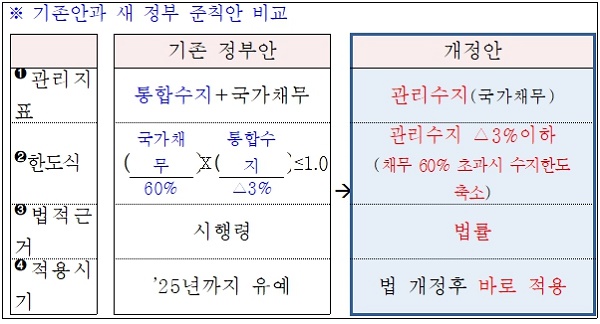 또 재정건전화 관리 지표는 통합재정수지 대신 나라 살림 상태를 알 수 있는 관리재정수지를 활용하기로 했다.