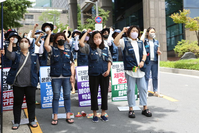 [일간환경연합 김경훈 기자] 민주노총 공공운수노조 국민건강보험고객센터지부는 14일 서울시 중구 국민건강보험 고객센터 하청업체 ㈜한국코퍼레이션 앞에서 확대 간부 결의대회를 열고 한국코퍼레이션를 규탄했다.