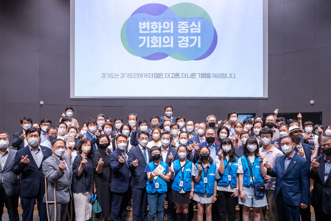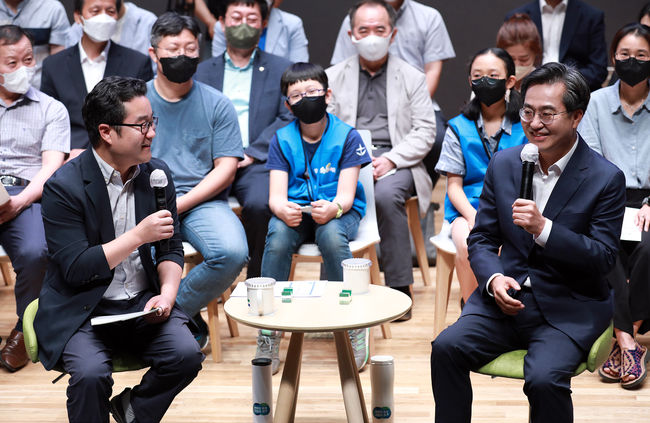 김동연 경기도지사는 15일 오전 10시 30분 도청 대강당에서 열린 ‘맞손토크-기회수도 경기를 말하다’ 행사에서 이같이 말했다. 반호영 경기도지사직인수위원회 공동위원장의 사회로 진행된 이 날 행사는 도지사가 도민과 만나 직접 소통하는 자리로 김동연 지사가 선거기간 동안 현장에서 만났던 다양한 지역민, 우수 정책제안자, 일반 도민 등 500여 명이 참석했다.