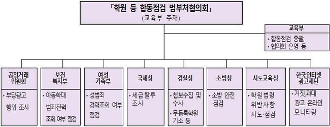이번 합동점검을 위해 교육부는 지난 7월 13일(수) 공정거래위원회, 보건복지부, 여성가족부, 국세청, 경찰청, 소방청 등이 참여하는 「학원 등 합동점검 범부처협의회」를 개최하고 관계부처 및 시도교육청 등의 협조를 구하였다.