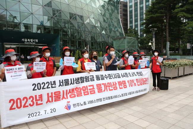 전국돌봄서비스노동조합 조합원들은 20일 서울 중구 서울시청 앞에서 `2023년 서울시생활임금 물가인상 반영 10% 인상 촉구` 기자회견을 가졌다. 이들은 “체감물가는 10%를 넘고 있는데 언제까지 노동자의 희생만을 강요할 것인가!”라면서 “시급 64원, 0.6%를 인상했다. 월급빼고 다 올랐다”며 생활임금 인상을 촉구했다.