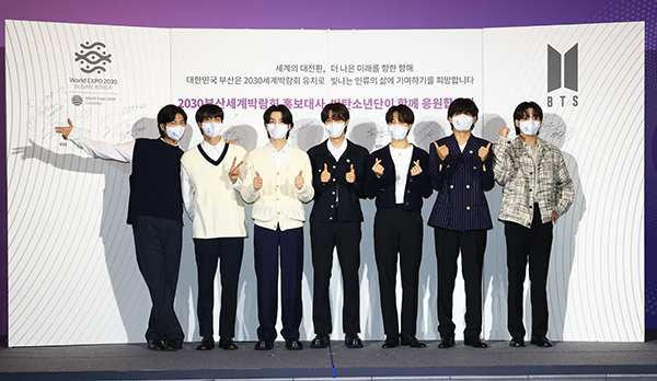 [일간환경연합 김경훈 기자]그룹 ‘방탄소년단(BTS)’이 2030 부산세계박람회 유치 홍보대사로 공식 위촉됐다.