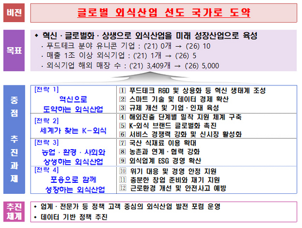 이번 계획에서는 ‘글로벌 외식산업 선도국가로 도약’을 새 비전으로 ▲혁신으로 도약하는 외식산업 ▲세계가 찾는 K-외식 ▲농업·환경·사회와 상생하는 외식산업 ▲포용으로 성장하는 외식산업 등 4대 전략과 12대 중점 과제를 추진할 계획이다.