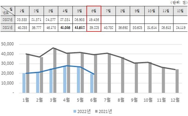 올 상반기 경기도내 부동산 거래량이 지난해 상반기보다 42.6%나 줄어든 것으로 나타났다. 그래프는 `22.6월 부동산 거래현황