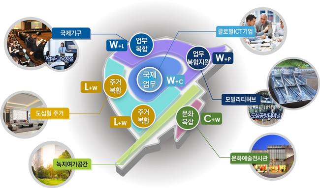 전체부지를 국제업무, 업무복합, 주거복합, 문화복합 등으로 계획해 미래형 도시공간을 창출한다. 국제업무구역에는 다국적 기업, 글로벌 IT기업을 입주시켜 국제업무기능을 강화한다. 업무복합구역에서는 업무시설, 첨단산업 위주의 기능을 도입한다. 주거복합구역은 도심형‧미래형 주거를 중심으로 업무, 상업, 문화 등이 복합개발된다.